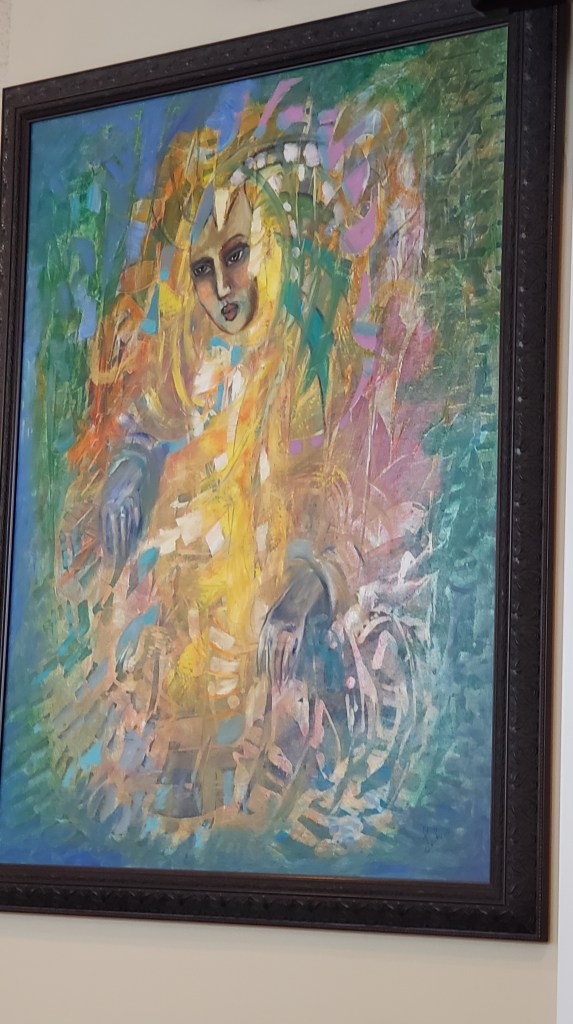 This painting hangs in the office of an eye dr. I can’t help but see how chaotic it seems until I really look at it. I see the face, then notice the hands.